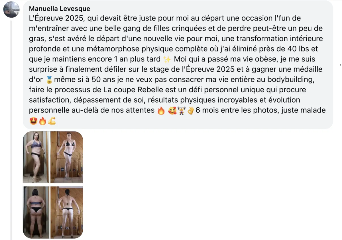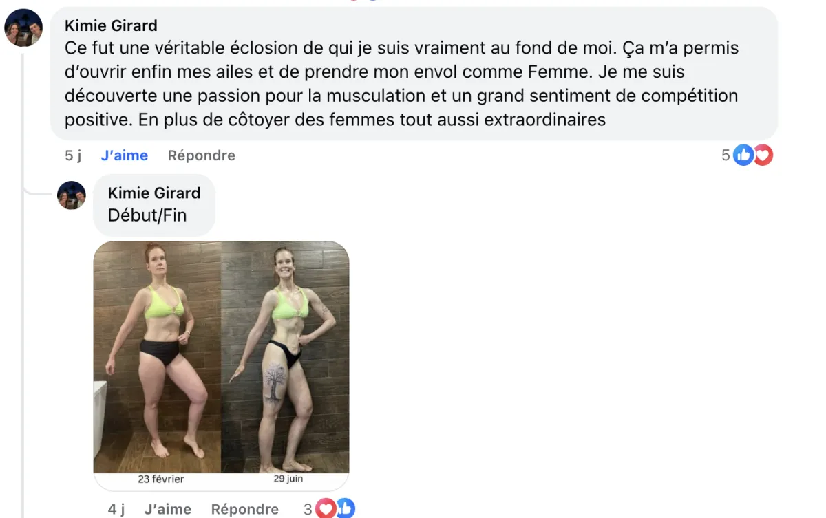 Si on m’avait dit qu’en 4 mois j’arriverais à ça, avec de la discipline, de la volonté, un plan structuré, une coach en or et un groupe de femmes rebelles plus que merveilleuses … je l’aurais fait crissement avant!!! Pis Je n’ai pas fini!!!
