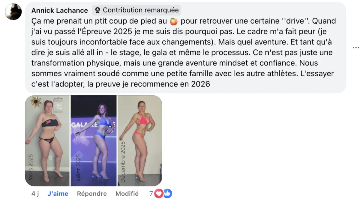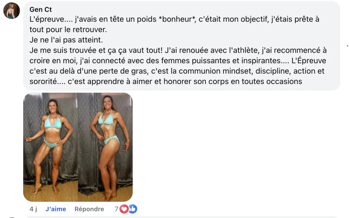 Mais cette transformation ne se fait pas sans engagement total : ça demande environ 4 mois de discipline intense, d'entraînements biquotidiens et d'une rigueur extrême, même lors des sorties au restaurant. Et j'adore ça parce que ça me fat sentir EN VIE, dans toute mon intensité.